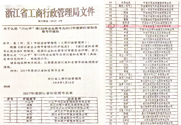 2018年1月16日,經(jīng)浙江省知名商號評審委員會評審,浙江省工商局認定的“浙江省知名商號”名單公布:寧波奔野重工股份有限公司的商號“奔野..