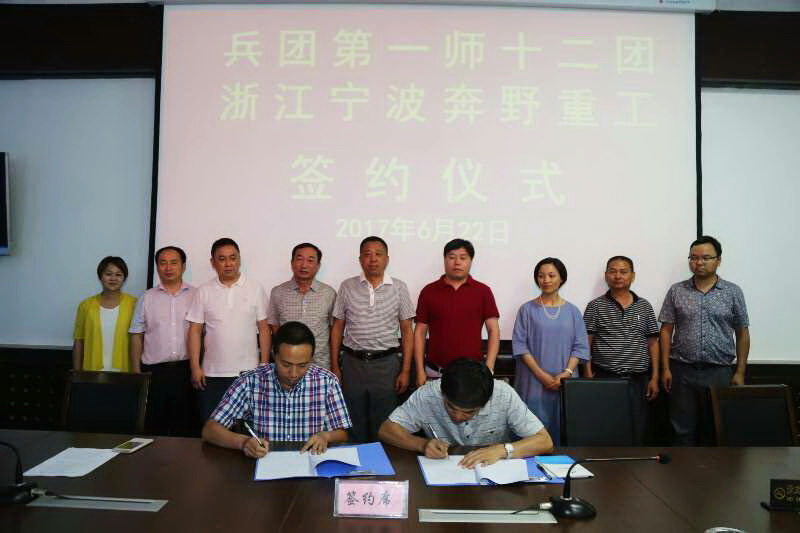 6月22日,寧波奔野重工董事長王興洪等公司領(lǐng)導在新疆出席兵團一師十二團項目合作簽約儀式。