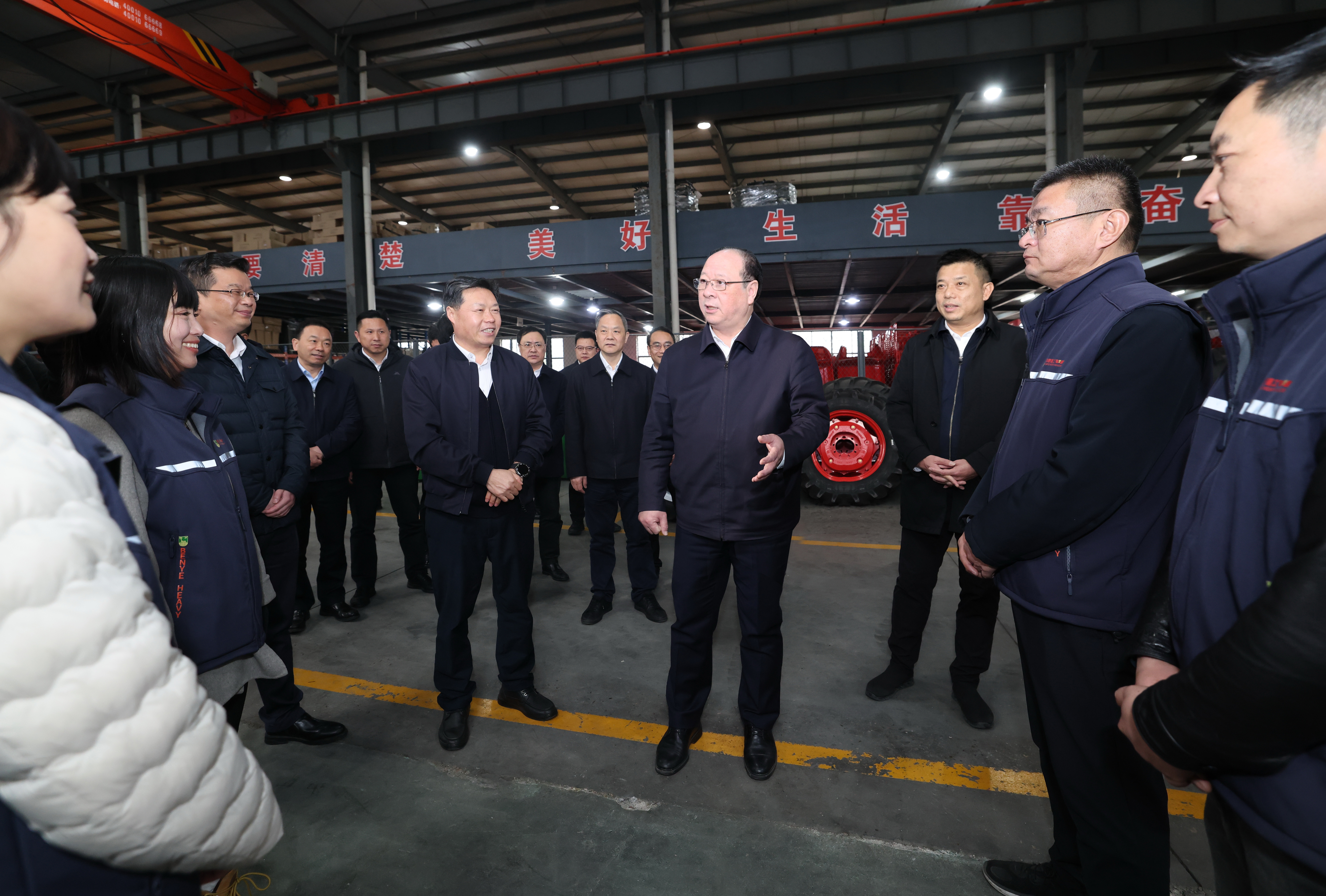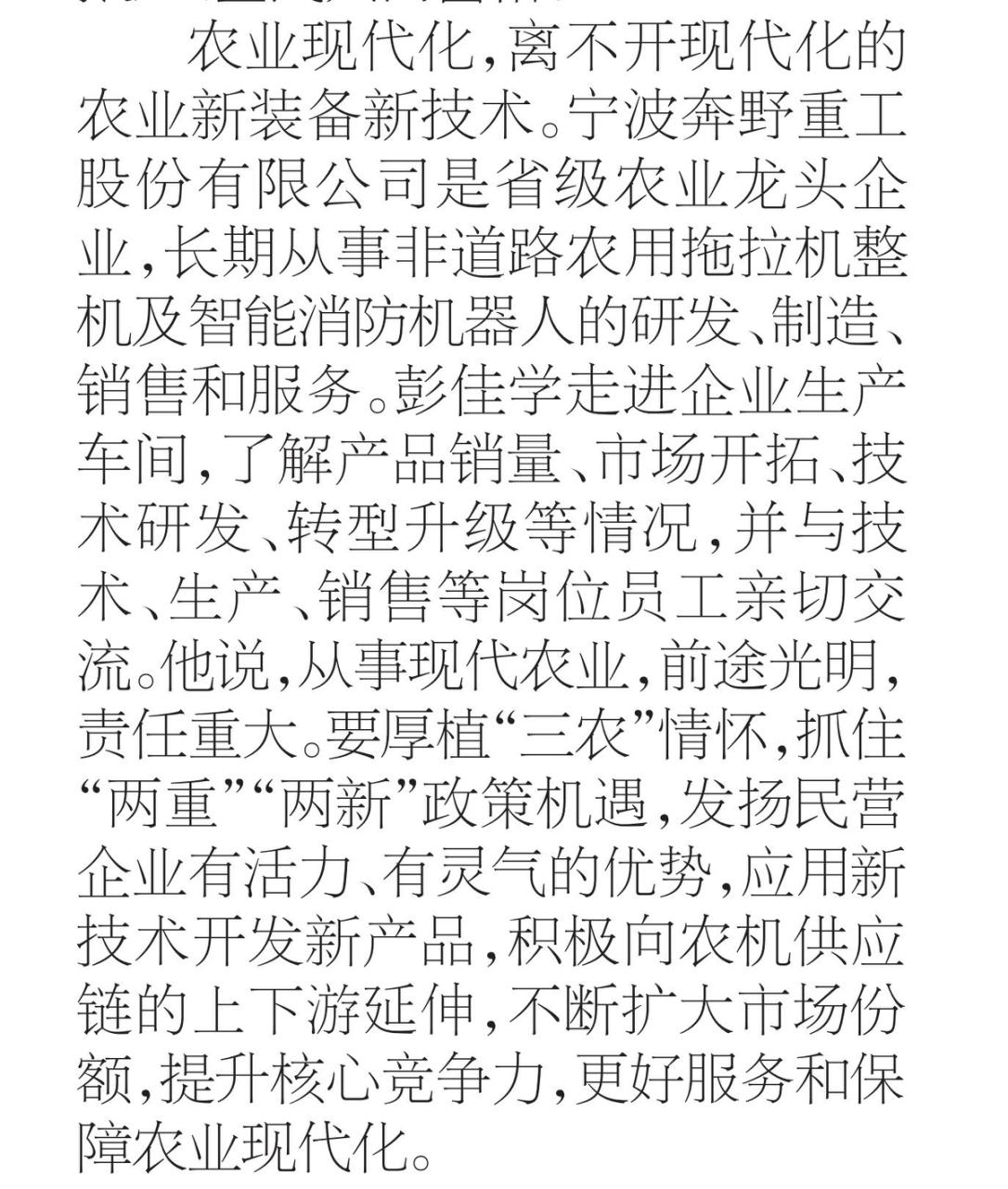 “農(nóng)業(yè)現(xiàn)代化,離不開現(xiàn)代化的農(nóng)業(yè)新裝備新技術。寧波奔野重工股份有限公司是省級農(nóng)業(yè)龍頭企業(yè),長期從事非道路農(nóng)用拖拉機整機及智能消防機器人的研發(fā)、制造、銷售和服務。彭佳學走進企業(yè)生產(chǎn)車間,了解產(chǎn)品銷量、市場開拓、技術研發(fā)、轉型升級等情況,并與技術、生產(chǎn)、銷售等崗位員工親切交流。他說,從事現(xiàn)代農(nóng)業(yè),前途光明,責任重大。要厚植“三農(nóng)”情懷,抓住“兩重”“兩新”政策機遇,發(fā)揚民營企業(yè)有活力、有靈氣的優(yōu)勢,應用新技術開發(fā)新產(chǎn)品,積極向農(nóng)機供應鏈的上下游延伸,不斷擴大市場份額,提升核心競爭力,更好服務和保障農(nóng)業(yè)現(xiàn)代化。”
