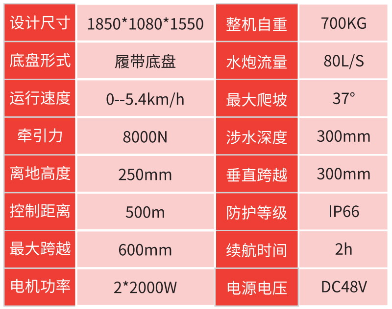 本消防機(jī)器人適用于部分火災(zāi)現(xiàn)場(chǎng)的火勢(shì)控制、洗消、降溫、環(huán)境信息采集等。本消防機(jī)器人具有防爆,越障能力強(qiáng),拖拽能力強(qiáng)的特點(diǎn)。
